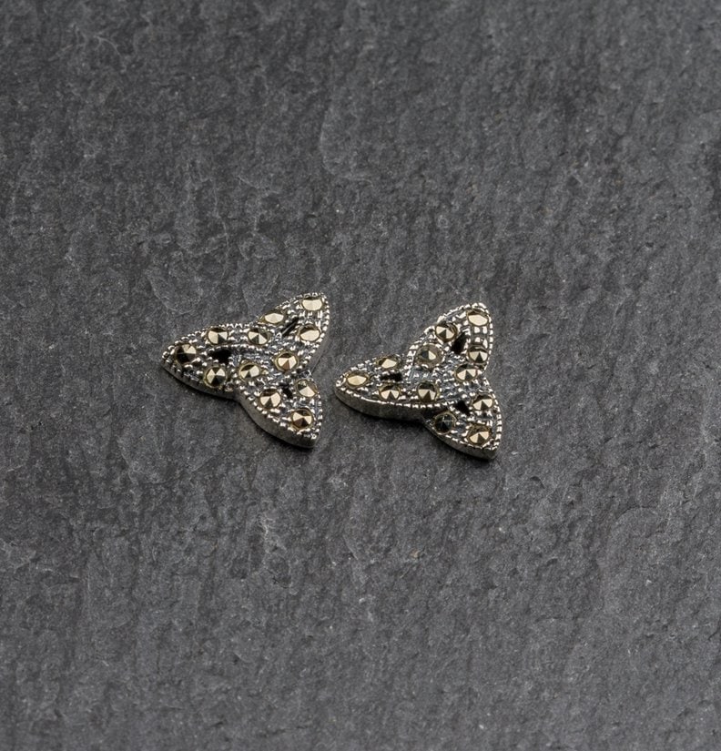 Trinity Knot Stud Earrings in Sterling Silver set with marcasite, Celtic Trinity knot with