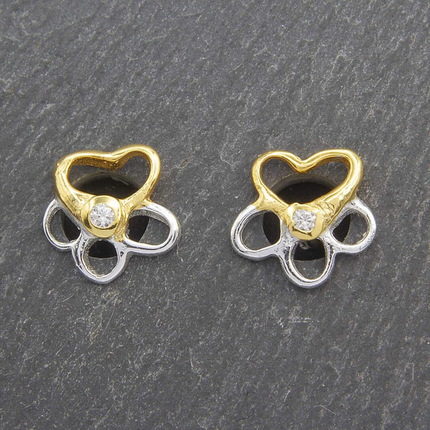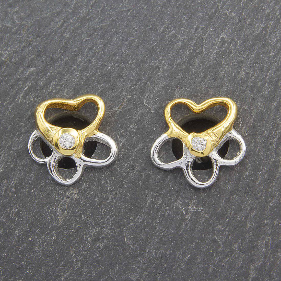 These charming sterling silver stud earrings feature a delicate open heart and flower design plated in yellow gold. Each earring is accented with a sparkling stone, adding a subtle touch of elegance. Presented in a stylish gift box, they make a perfect gift for someone special, symbolising love and nature’s beauty.