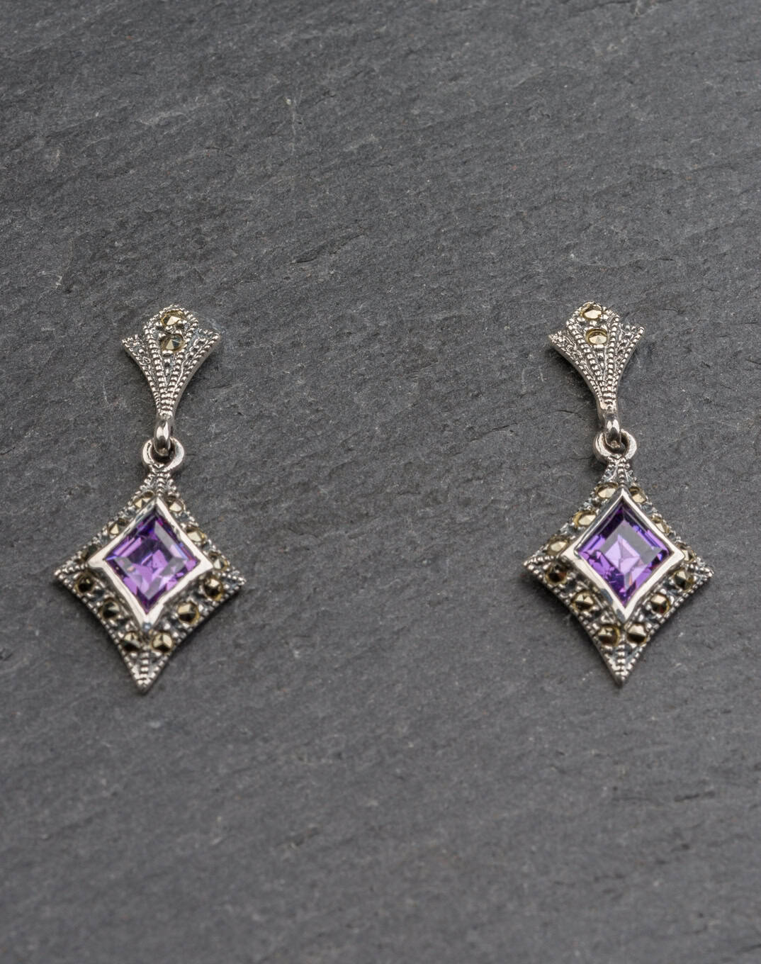 Sterling silver 925 set with amethyst cubic zirconia and marcasite drop earrings. Art Deco style.