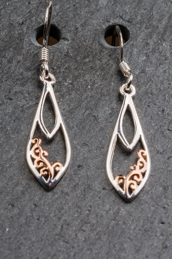 Presenting a pair of elegant drop earrings featuring a sterling silver teardrop with delicate rose gold filigree work. The lightweight design ensures effortless wearability, making it a perfect accessory for everyday use. These dangle earrings are a highly sought-after gift item for women, and they are packaged in a beautiful gift box, ready to be presented as a gift!