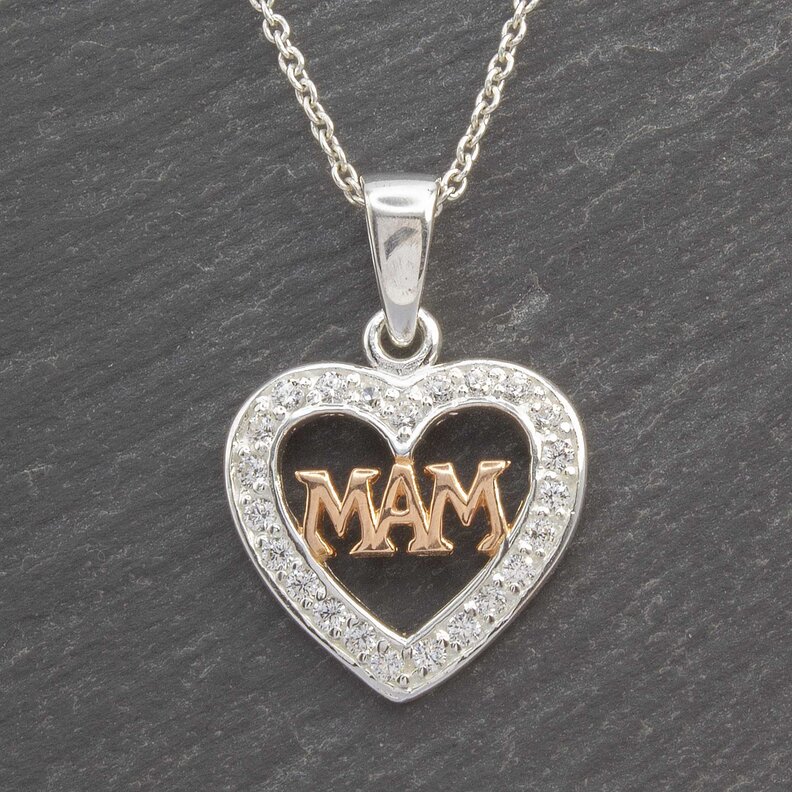 This is a Sterling Silver and rose gold Heart Pendant, designed as a heartfelt tribute. The pendant features a sparkling heart-shaped frame adorned with cubic zirconia stones, surrounding the word “Mam” in bold, polished lettering. This elegant piece is perfect for showing appreciation and love for a mother, or “Mam” – as we say in Wales! It comes with a matching silver chain in a gift box making it a meaningful and thoughtful gift for special occasions.
