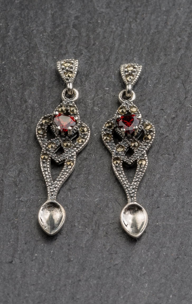 These sterling silver drop earrings showcase a Welsh Celtic love-spoon motif, embellished with sparkling marcasite stones and a red ruby zirconia gemstone, for a striking and enchanting addition to any outfit.
